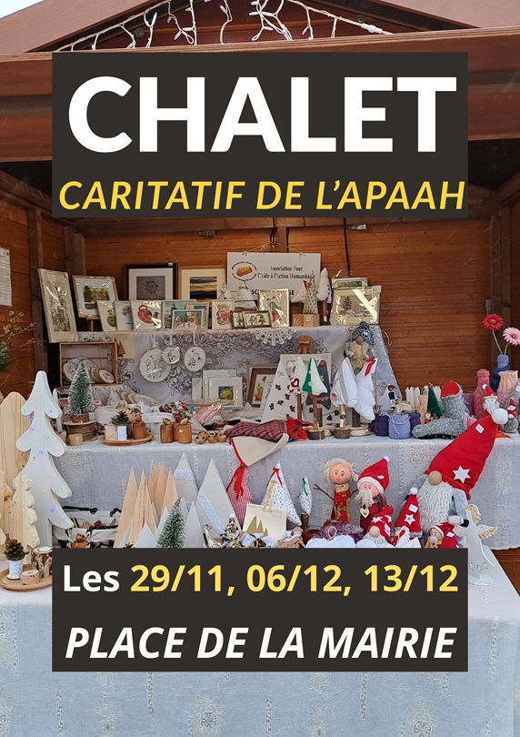 L’ASSOCIATION POUR L’AIDE À L’ACTION HUMANITAIRE (APAAH) invite amis et adhérents à un Noël de partage. Vente d'objets de Noël, tableaux et créations des membres pour soutenir divers projets. Café, chocolat chaud, Maenele et vin chaud seront disponibles.